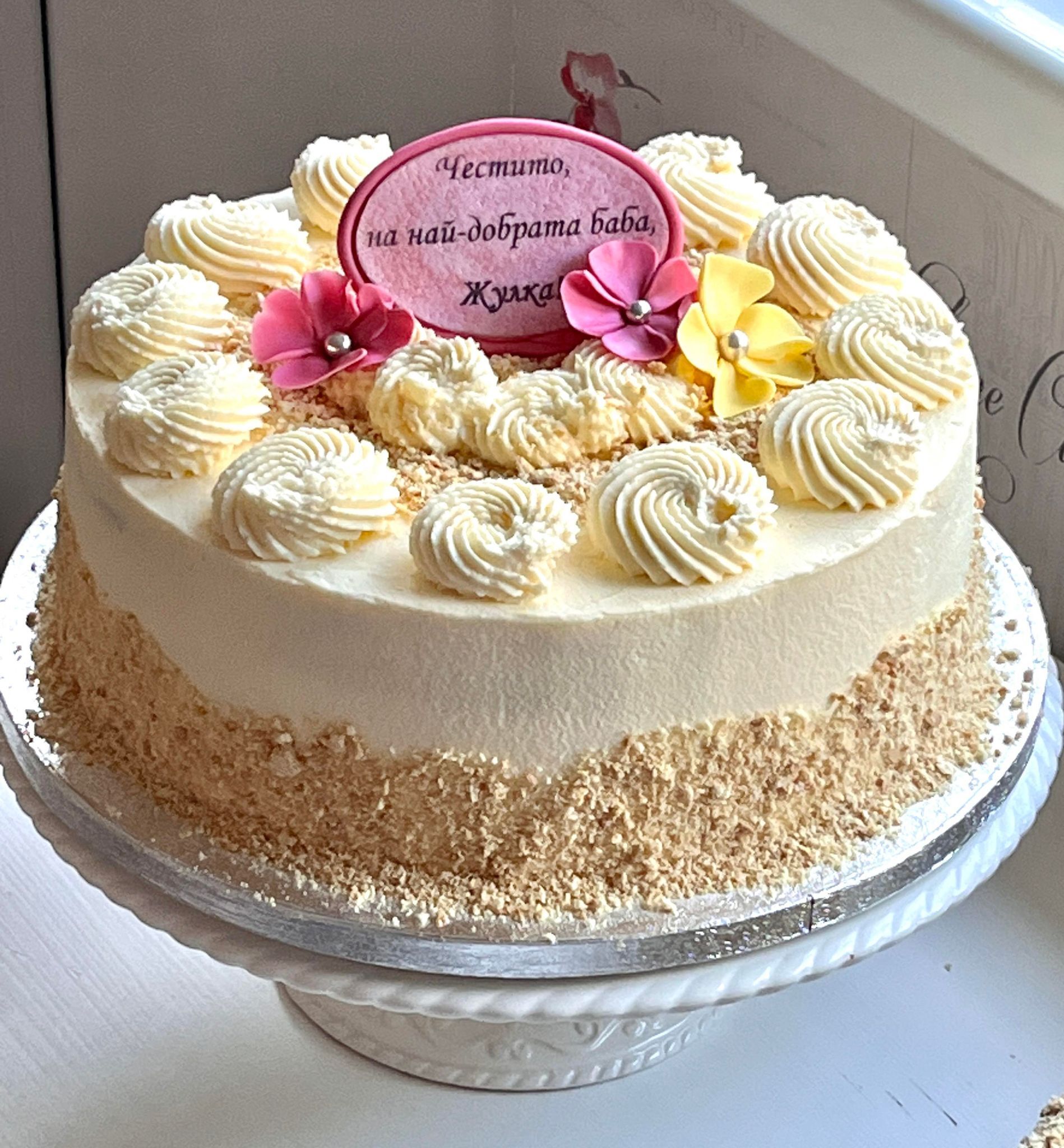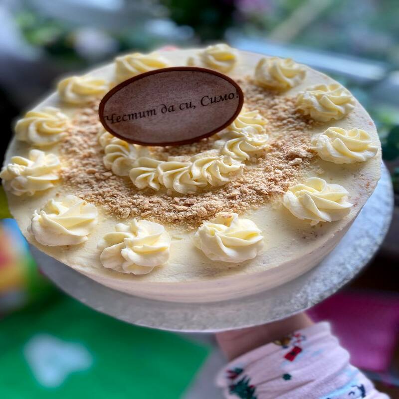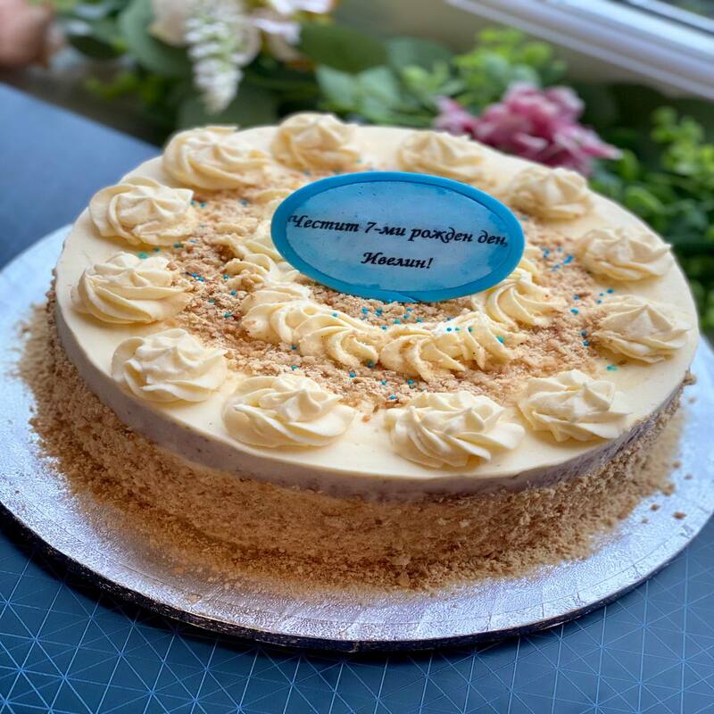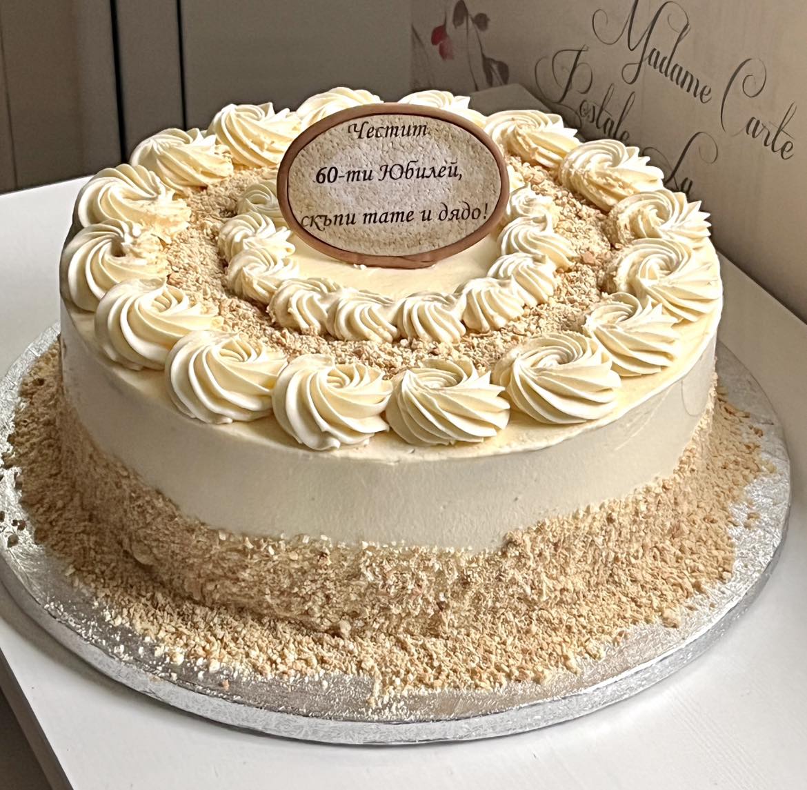 Тортата се предлага в 12 и 16 порции в зависимост от нуждите на Вашия празник с възможност да добавите и персонализирана табелка