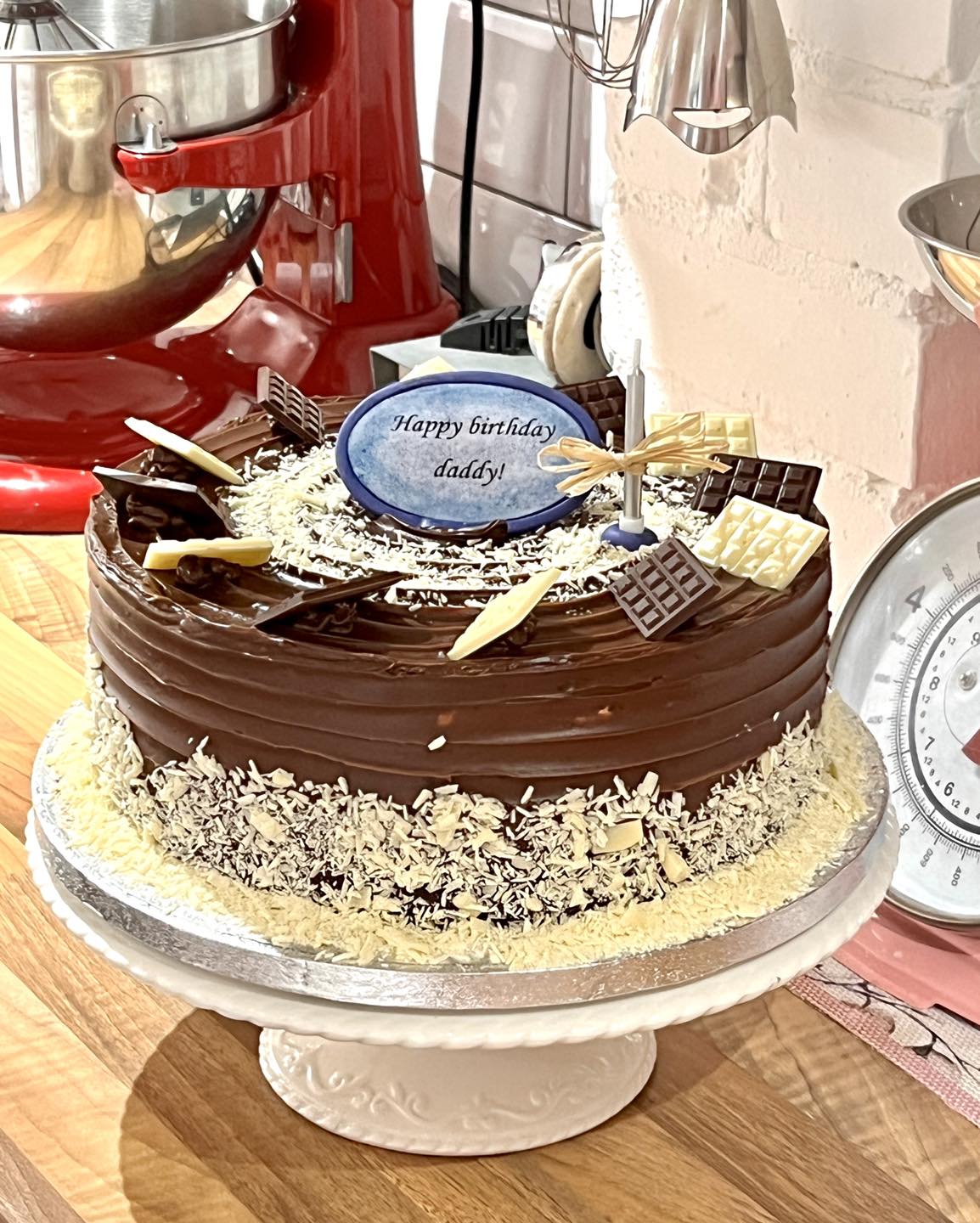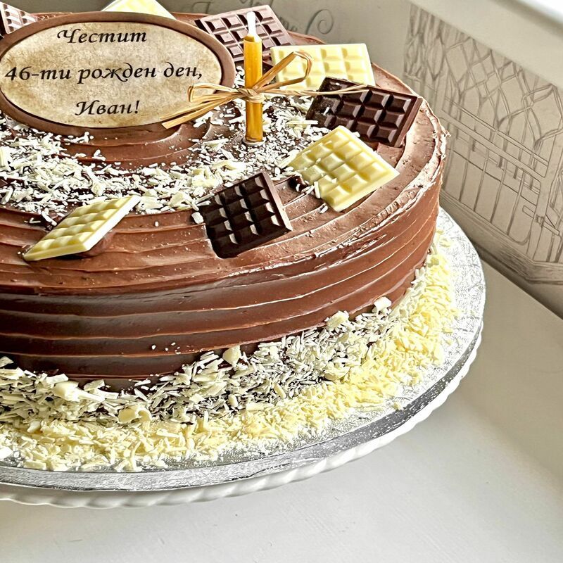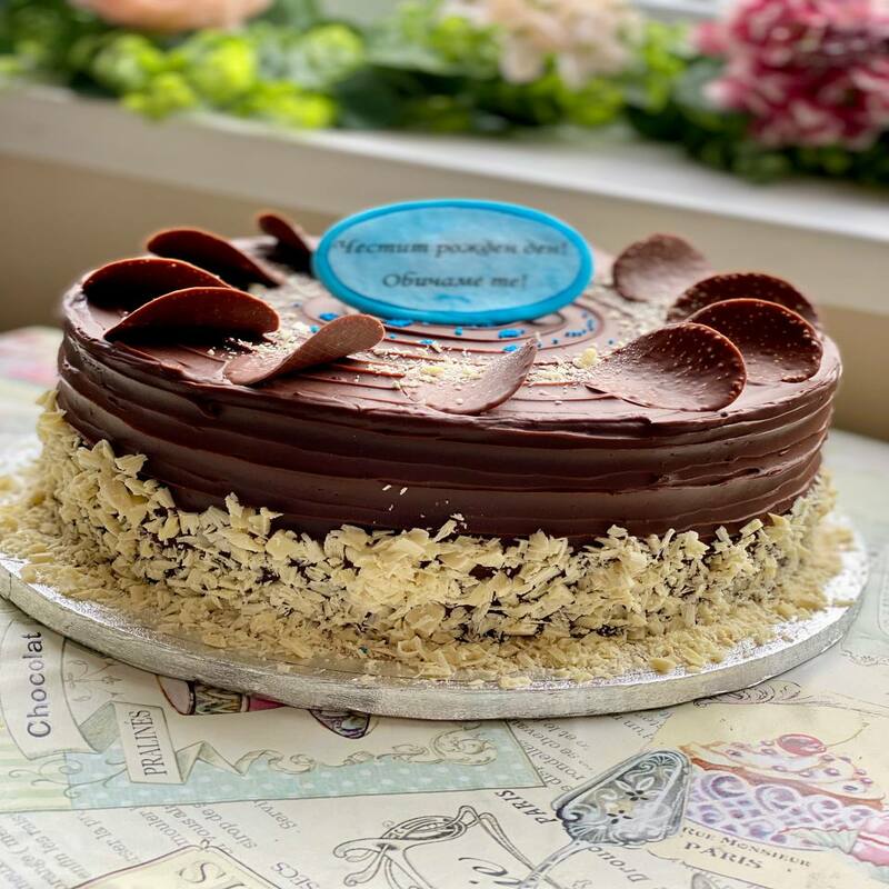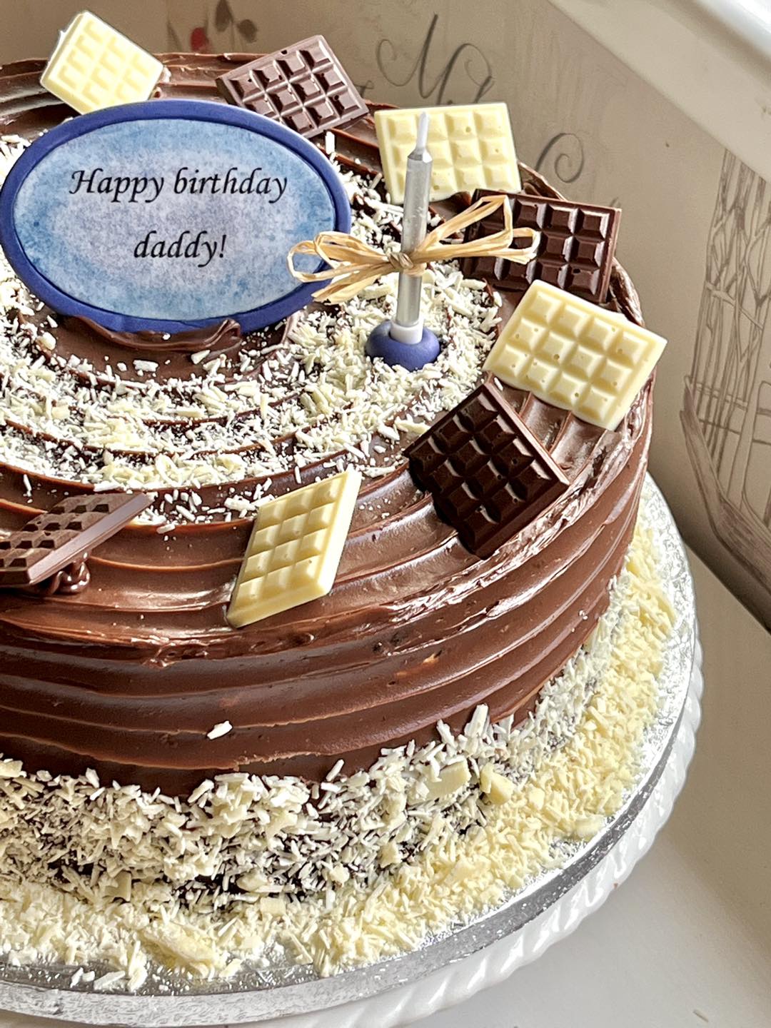 The Two Chocolate Cake is made with chocolate sponge layers combined with white and milk chocolate cream.