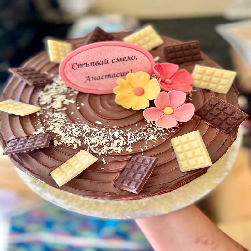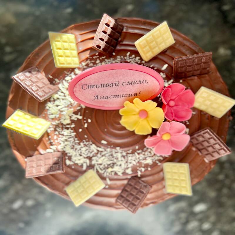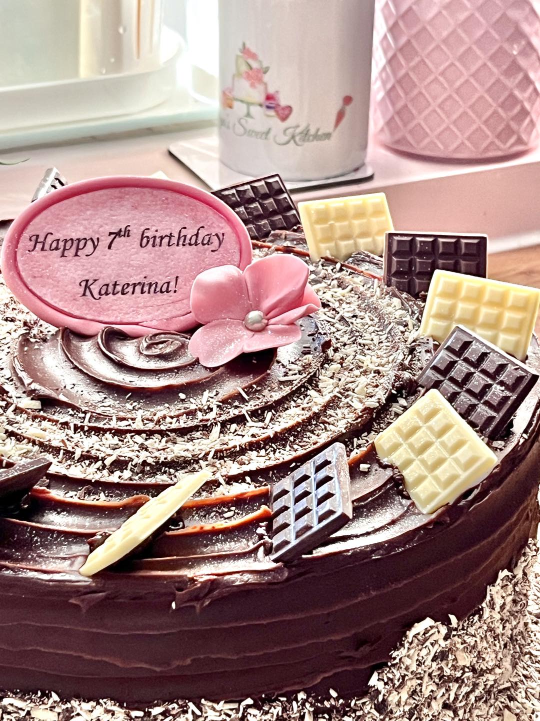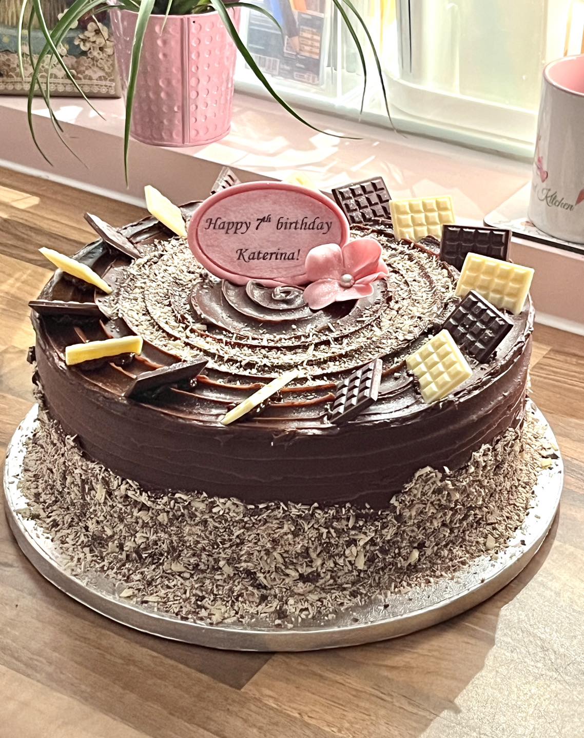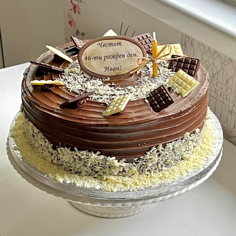 The Two Chocolate Cake is made with chocolate sponge layers combined with white and milk chocolate cream.